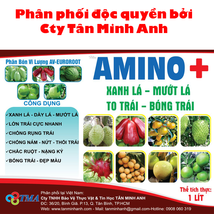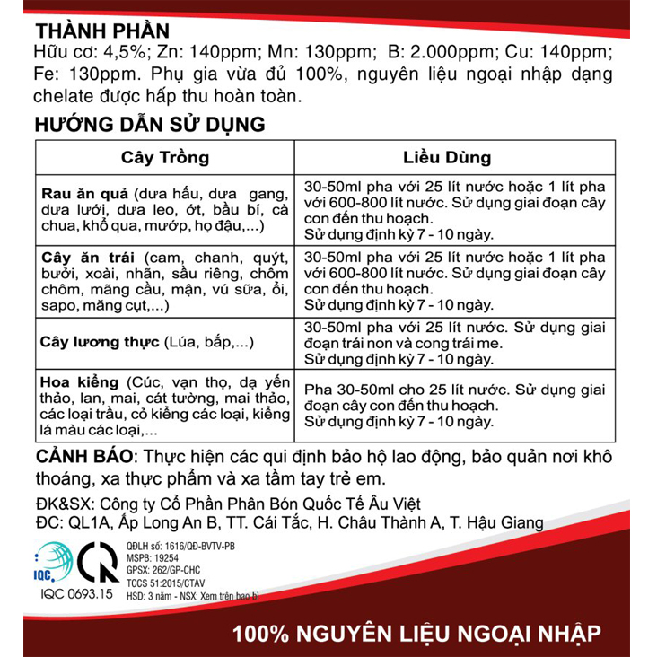 Ca: 50g/l; N: 10g/l (N-Amino) B: 50ppm;Fe: 50ppm; Mn: 25ppm; Zn: 10ppm; phụ gia vitamin, acid amin…