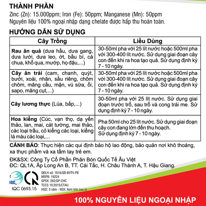 Nguyên liệu 100% ngoại nhập dạng chelate. Được hấp thụ hoàn toàn