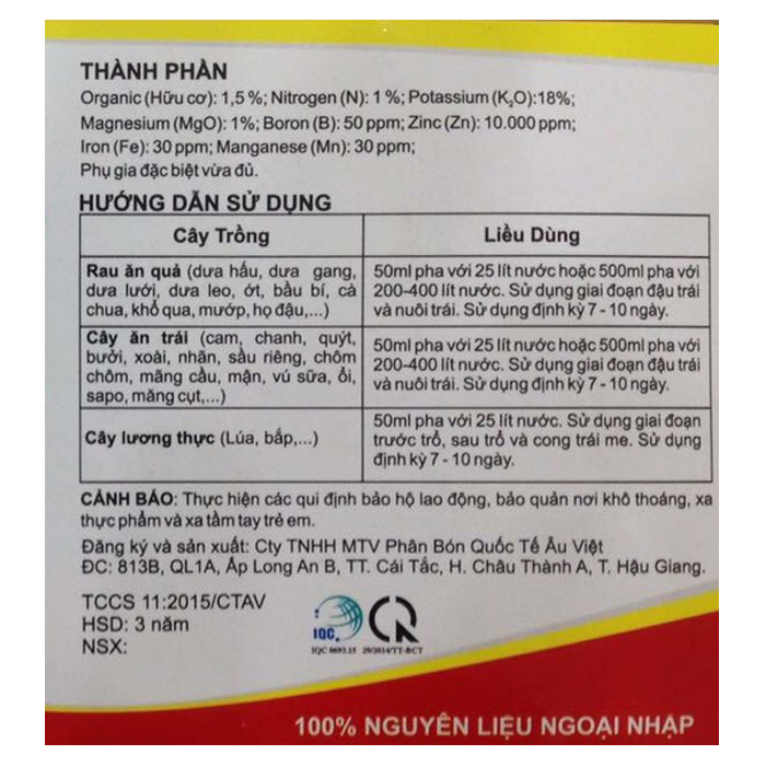 Organic (Hữu cơ): 1,5%; Nitrogen (N): 1%; Potassium (K2O): 18%
